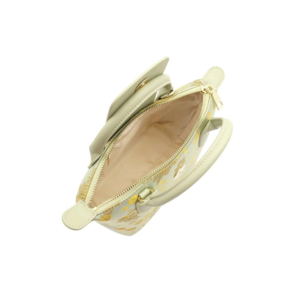 Petite structured satchel featuring a soft mint base with gold fairy and floral motifs, finished with smooth matching trim and a snap‑flap detail. Comes with a detachable crossbody strap for hands‑free wear.